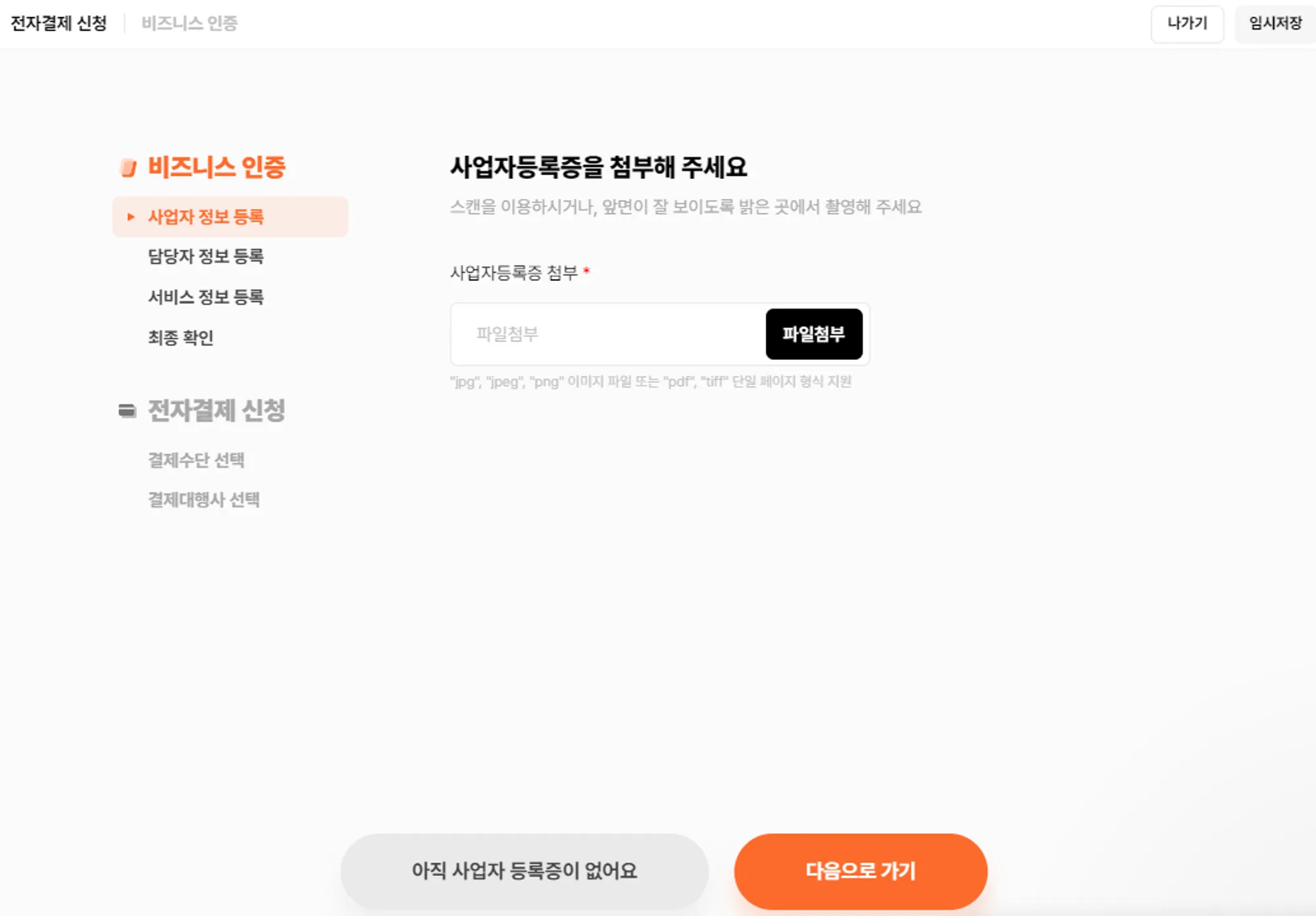 • 사업자 등록증이 없는 경우 전자결제 신청이 불가능합니다. 사업자 등록 이후 서비스를 신청해 주세요.