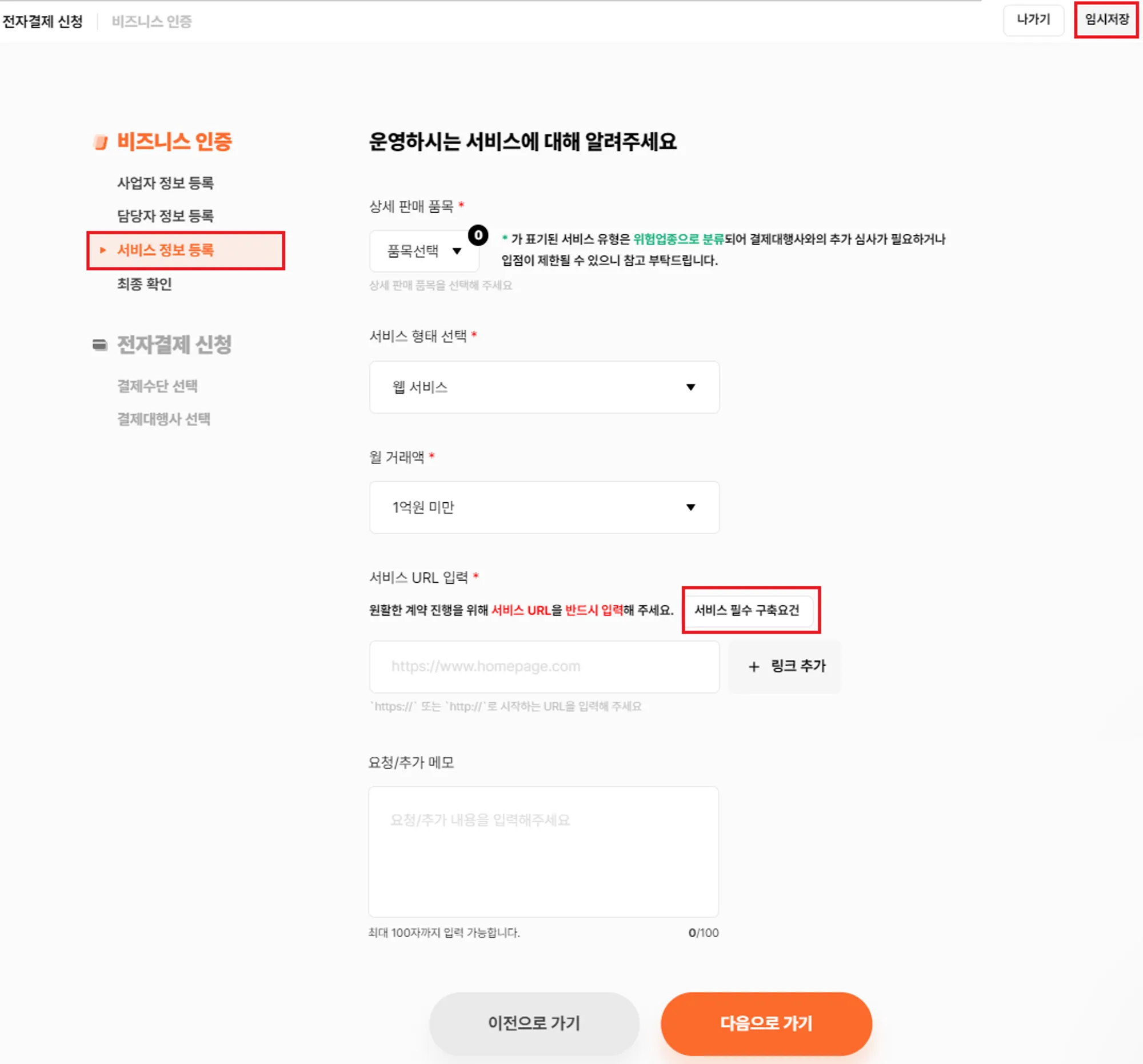• 서비스 URL 입력 : 결제대행사 계약을 진행하기 위해서는 운영중인 서비스(웹/앱)의 URL을 입력해야 합니다. 원활한 계약을 위해서 아래 서비스 기본 구성 요건을 확인하신 후 서비스에 반영이 필요합니다.