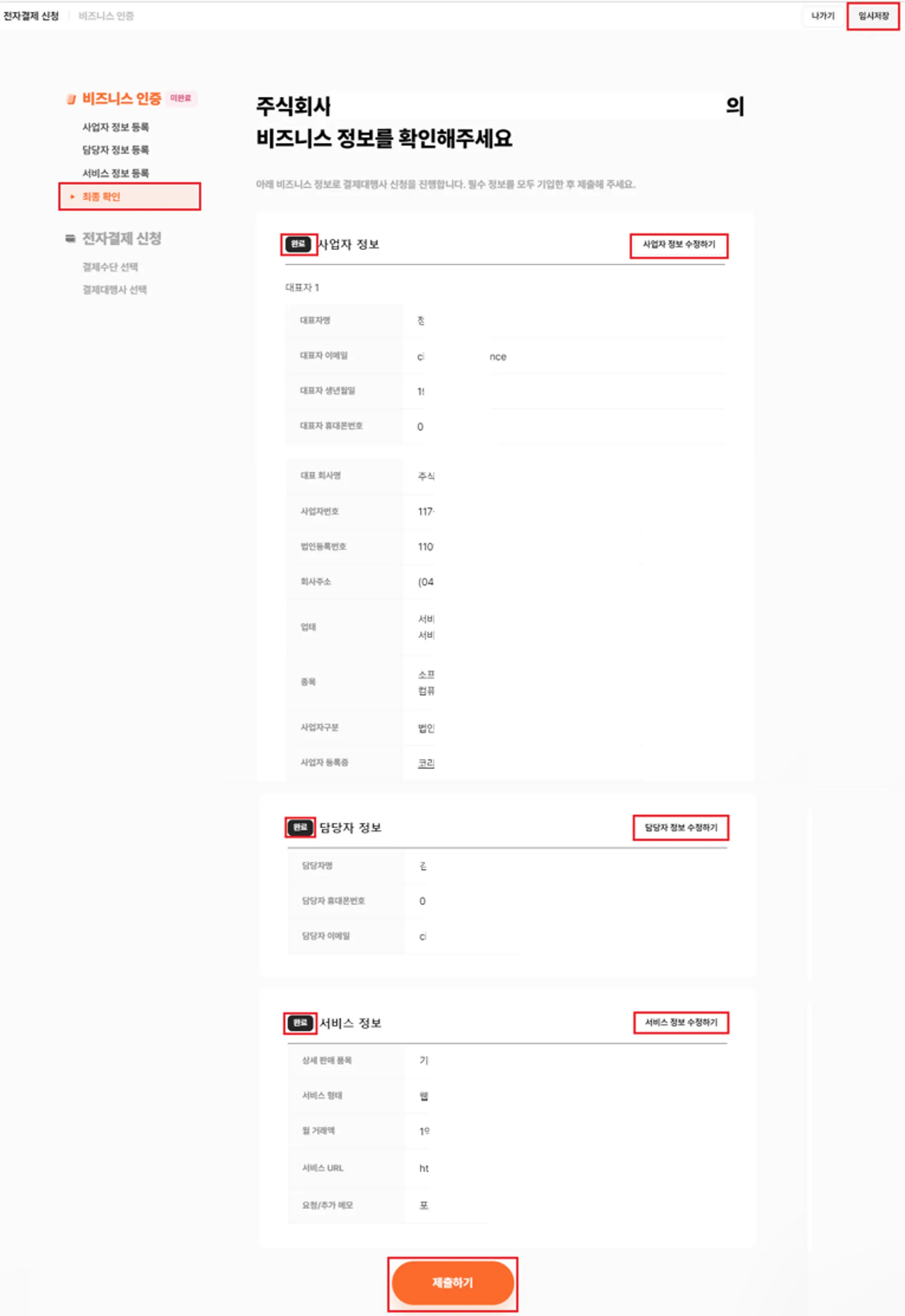 • 주의 : 제출 이후 이미 등록한 비즈니스 정보에 대해서 수정이 필요한 경우 상점·계정관리의 사업자 정보에서 정보 수정 요청을 클릭하여 포트원 고객센터를 통해 수정이 가능합니다.