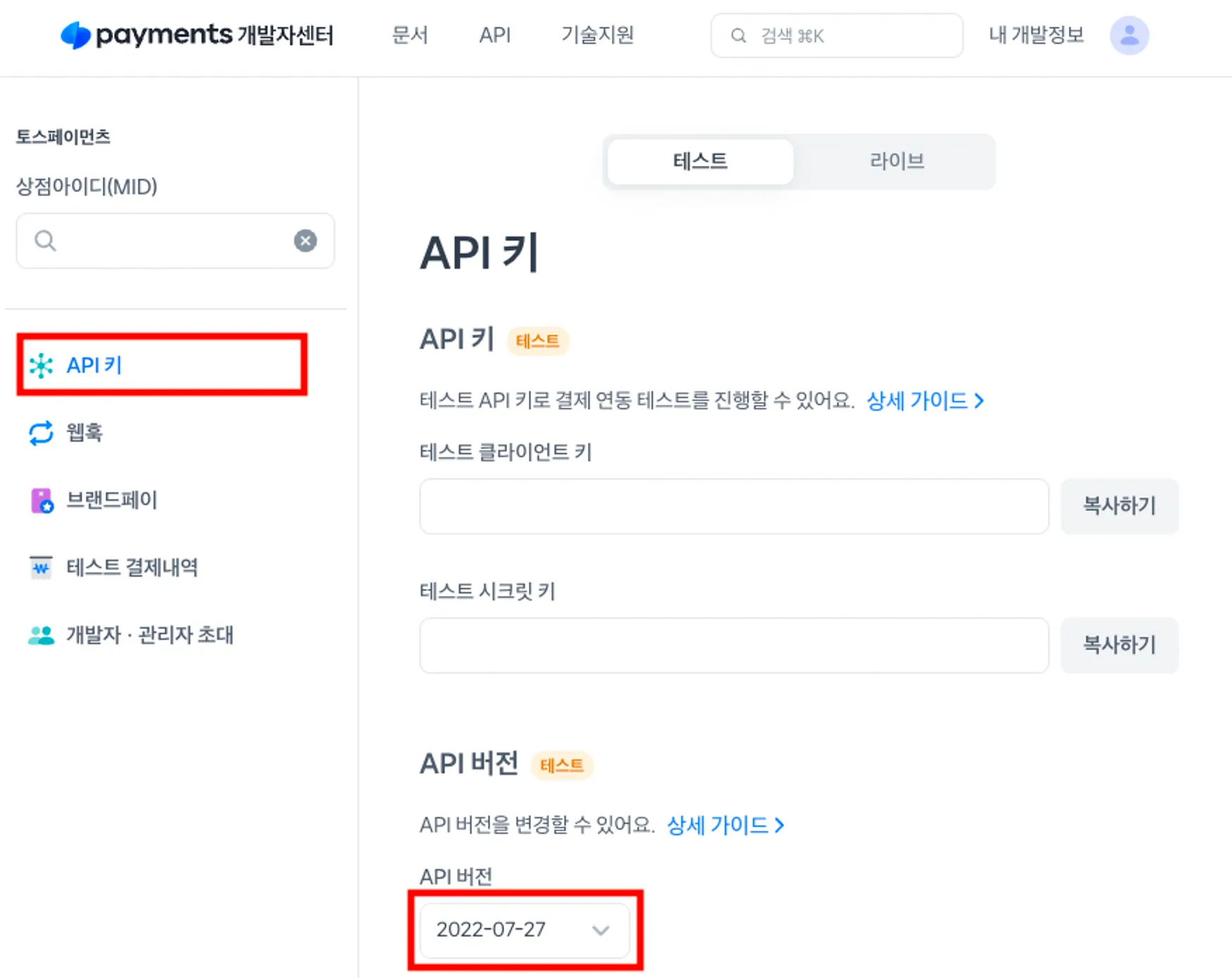 API 버전을 다르게 설정하면 결제 승인 / 실패 시 실제 응답과 다른 응답을 받아볼 수 있으니 반드시 API 버전을 2022-07-27로 맞춰주시기 바랍니다