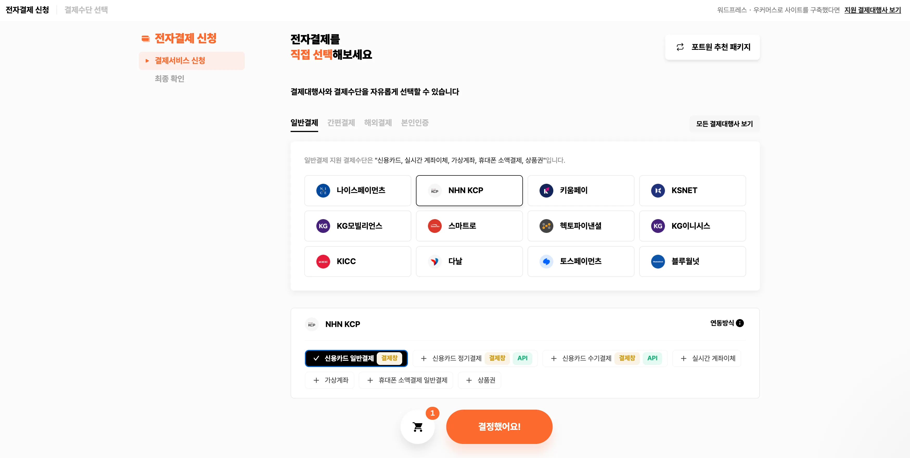 앞으로는 한 페이지에서 결제수단별로 이용 가능한 결제대행사를 확인하고, 결제형태까지 선택해보세요. 선택한 결제서비스는 장바구니에 담겨 즉시 확인하고 수정할 수 있습니다.